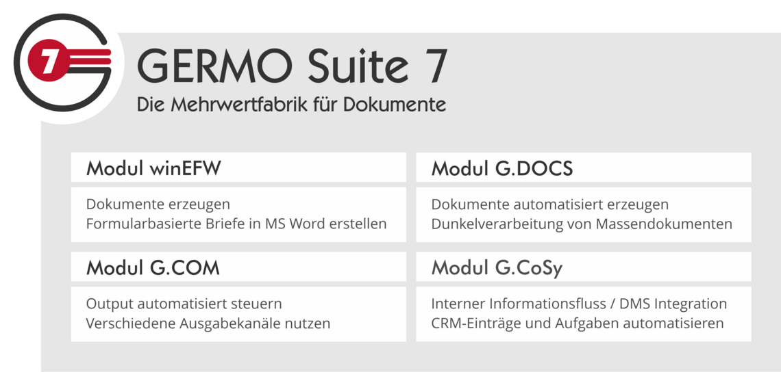 In der GERMO Suite 7 ist die bewährte Lösungsfamilie in einer komplett neuen Version zusammengefasst. Neben vielen neuen Funktionalitäten wie z. B.