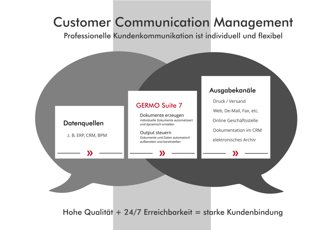 CCM-Software: Customer Communication Management Software automatisiert und optimiert die Kundenkommunikation und stärkt damit auch die Kundenbindung. In diesem Zusammenhang wird gern von „hyperpersonalisiert“ gesprochen. Unserer Ansicht nach ein Modebegriff für das, was wir schon seit Jahren als Maßstab setzen. Personalisierung ist selbstverständlich nicht mit der persönlichen Anrede erledigt. GERMO setzt auf regelbasierte Dunkelverarbeitung zur Abbildung komplexer Prozesse.